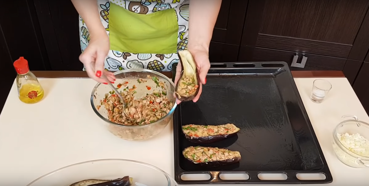 нарезанными травами, сахаром, солью и перцем. Выньте запеченные баклажаны из духовки. В