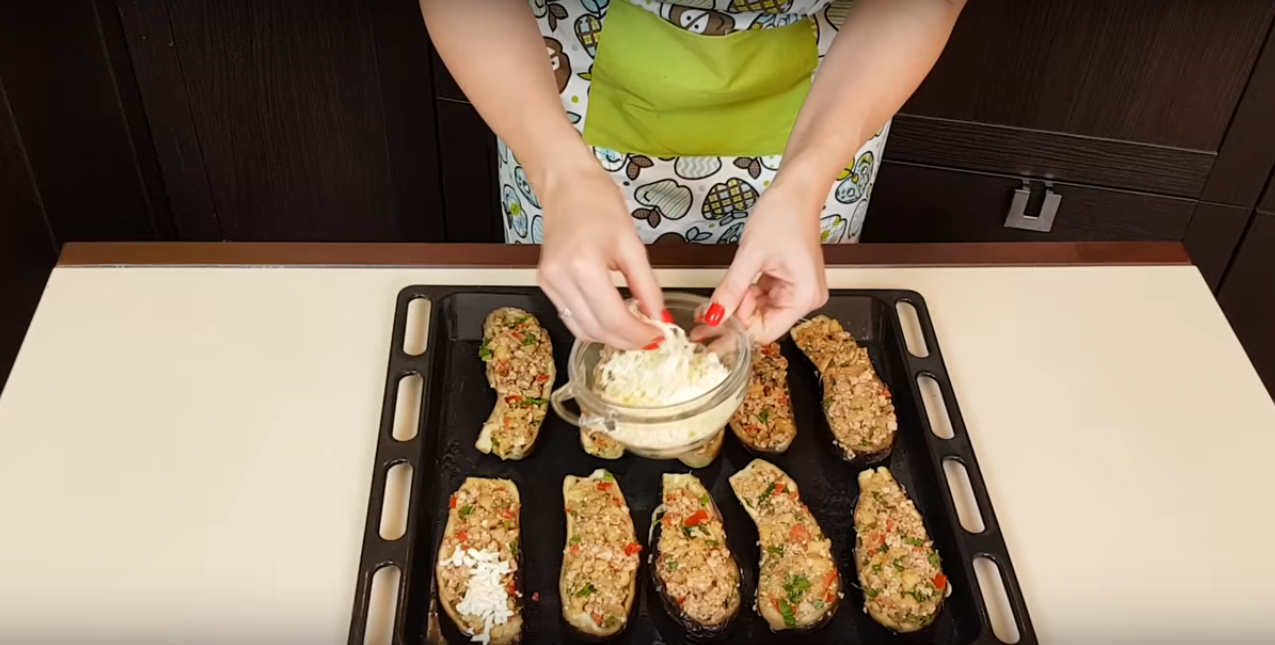 полностью покрывать ломтики запеченных баклажанов. Верх блюда