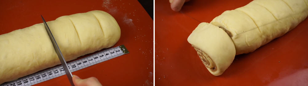 - Заготовка плотно сворачивается и нарезается кусочками, ширина которых составляет около 3 см.