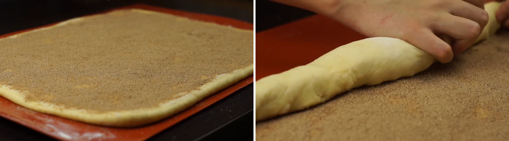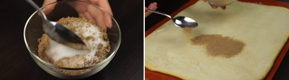 Сделайте начинку. Для этого 3 столовых ложки сахара смешайте с одной столовой ложкой корицы и густо посыпьте поверхность раскатанного теста. Затем аккуратно и равномерно скрутите тесто в рулет.