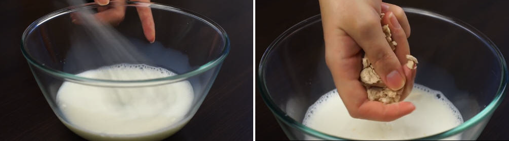 В мисочку выливаем 200 мл. теплого молока и растворяем в нем 1 столовую ложку сахара. Раскрошим руками 25 грамм живых дрожжей (всыпьте, если у вас дрожжи сухие), перемешиваем и оставляем на 10 минут, чтобы они разошлись.