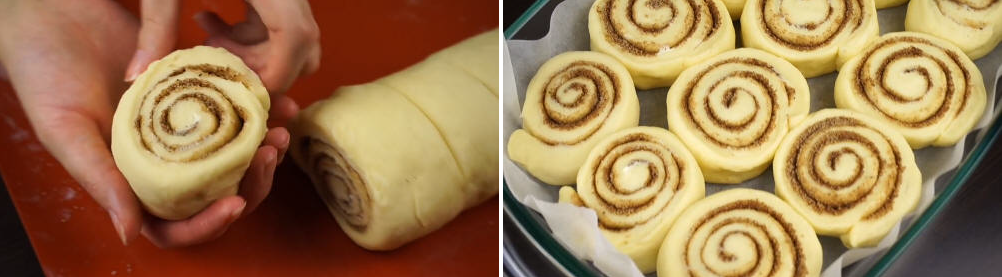 6. Рулет разделите на 12 равных частей. Получившиеся заготовки выложите на противень, застеленный бумагой для выпечки. В духовке они значительно увеличатся в размере, поэтому выложите их на расстоянии друг от друга. Хвостик спрячьте под булочку, чтобы она не раскрутилась.