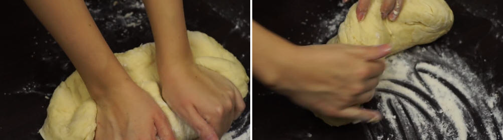 5. Когда массу станет уже тяжело замешивать ложкой, присыпать стол мукой и выложить его. Продолжить замес уже на столе. Месить до тех пор, пока тесто не станет отходить от рук. При этом оно не должно стать жестким.