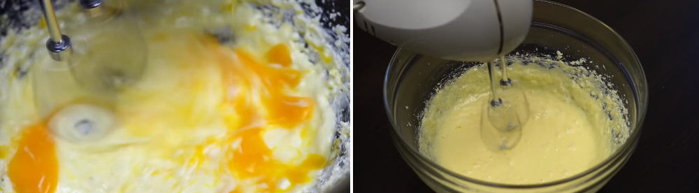 Не прекращая взбивать, поочередно, по одному, добавляем в смесь 2 яйца.