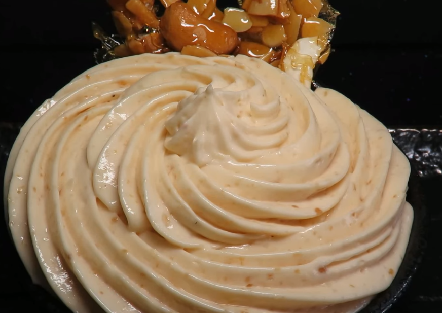 После добавляем карамель и вливаем холодные сливки, продолжаем взбивать до загустения. Получившийся крем перекладываем в кондитерский мешок с насадкой «закрытая звезда», охлаждаем в течение 1 часа.