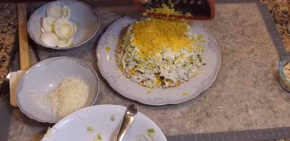 3. Затем сверху натрите сыр на крупной терке и добавьте кукурузу, предварительно слив с нее жидкость. Пропитайте майонезом.