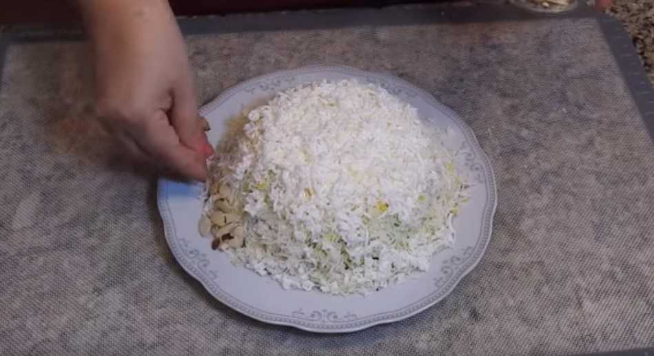Завершающим слоем посыпаем содержимое желтком. Украшаем листочками салата, и кусочками продуктов, что находятся внутри.