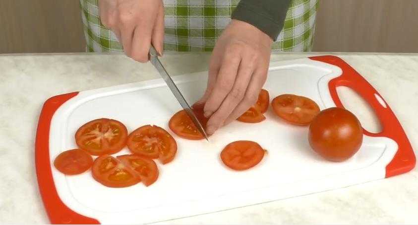 - Помидор нужно нарезать небольшими кубиками. Перед тем, как приготовить блюдо, можно снять с томата кожицу.