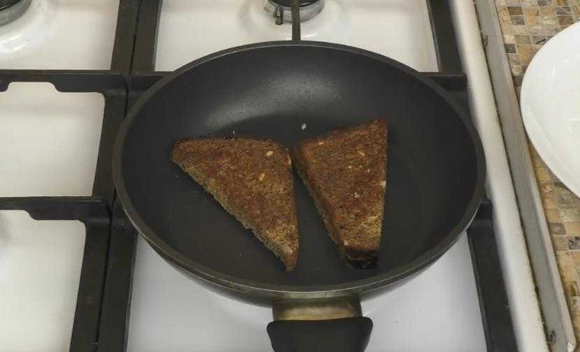 - Ломтики хлеба выложите на сковороду с небольшим количеством подсолнечного масла. Подрумяньте с одной стороны, переверните.