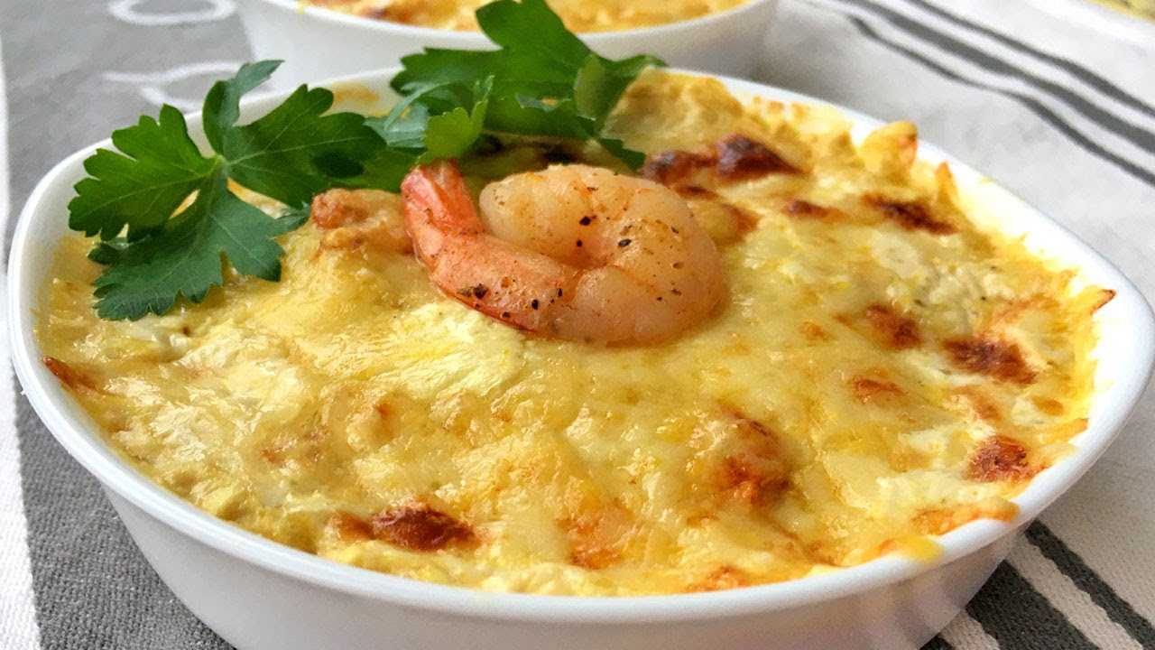 - Тем временем мелко нарежьте лук и обжарьте его в сливочном масле на среднем огне. Разложите сырые креветки с жареным луком в форму для выпечки. Полейте соусом и посыпьте тертым сыром пармезан. Поместите жюльен в духовку на 15-20 минут. Когда блюдо будет готово, украсьте его зеленью.