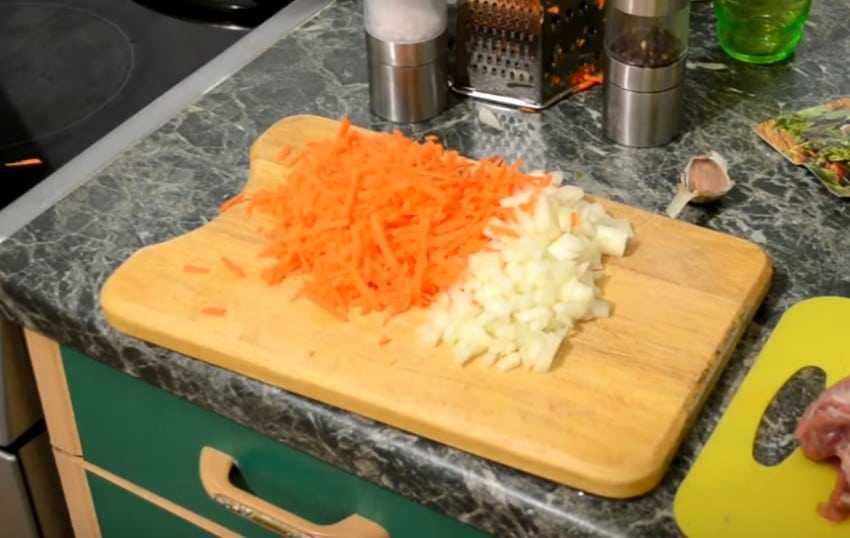 - Крупно потрите морковку, головки лука нарежьте полукольцами.