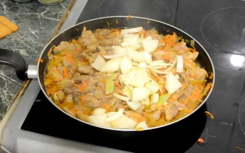 Шаг 4. Когда мясо подрумянится, добавьте к нему репчатый лук, продолжайте жарить, пока лук не станет полупрозрачным.