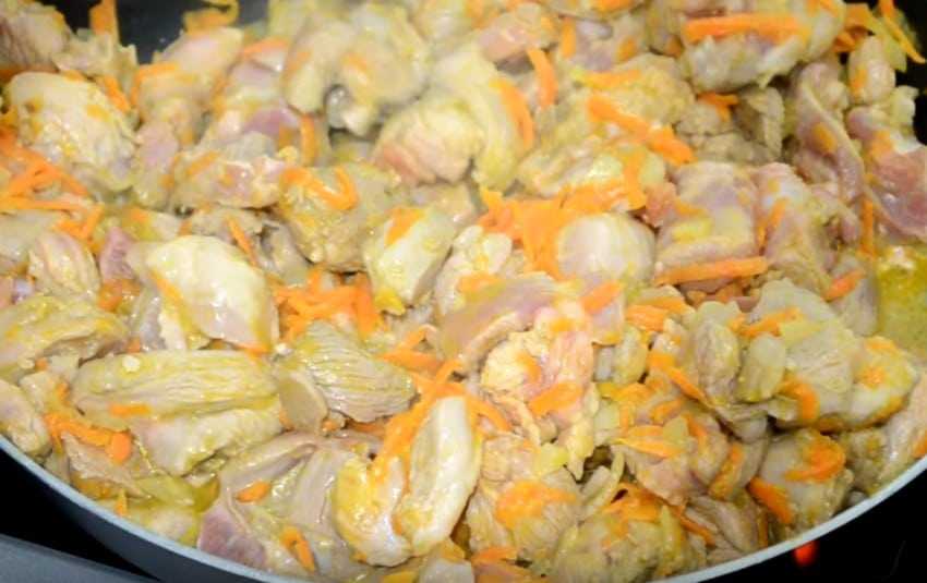 - Нарежьте брусочками индюшачье филе. Отправьте на сковороду к моркови с луком. Жарьте почти до готовности мяса, не забывая помешивать.