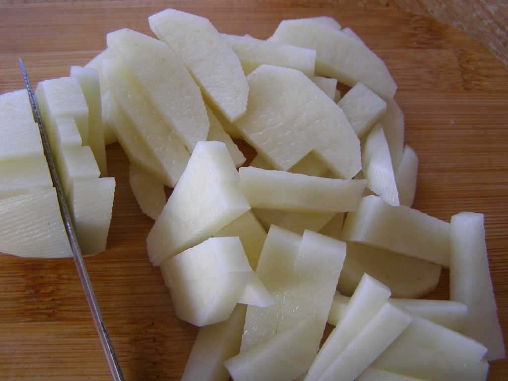Вот все и готово для готовки. Теперь можно и картошечку нашинковать. Пускай это тоже будет соломка. Кстати, стараться надо так, чтобы печень и картошка были почти в одинаковой пропорции.