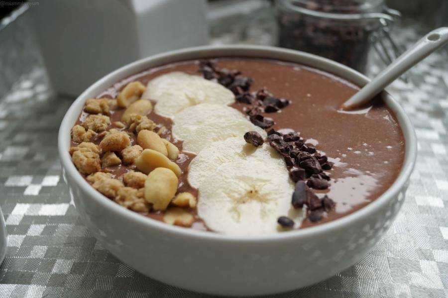 Смешай в блендере все компоненты коктейля до состояния пюре. Перелив смесь в тарелку, сделай верхушку из какао-бобов, любимой гранолы, измельченного арахиса и кусочков банана. Наслаждайся!
