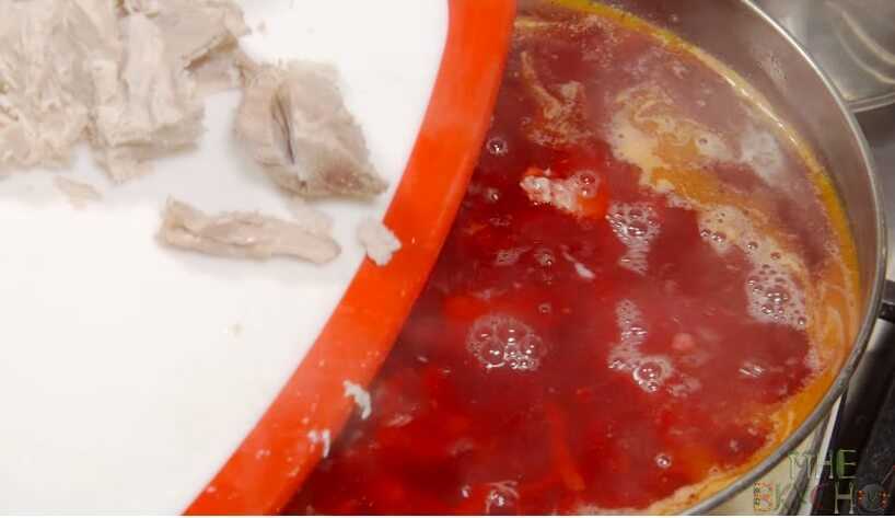 Перед тем как подать к столу, борщ нужно еще раз перемешать, а мясо порезать на кусочки.