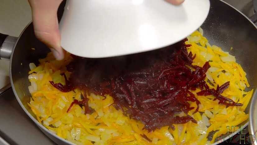- Когда лук станет золотистого цвета, он готов и можно добавлять натертую свеклу.