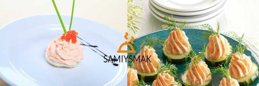 - Филе красной рыбы нарежьте тонкими полосками. Каждую полоску сверните рулетиком, будто розой.