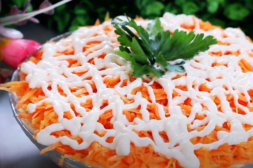 Первый слой. Смешать натертую на крупной терке отварную морковь, плавленый сырок и 3 измельченных яйца.