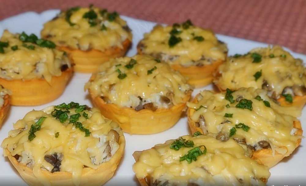 Запечённые под сыром тарталетки с грибами и курицей