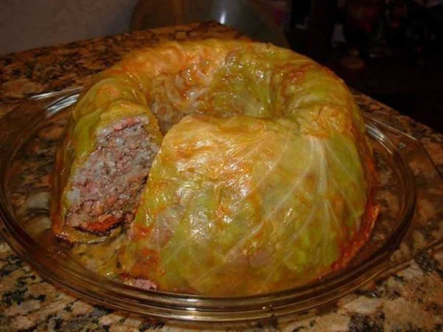 Это незаменимое блюдо в виде пирога, когда нужно накормит голодную семью, а времени совершенно нет, потому что хозяйство большое. У пирога будет 2 капустномясных слоя и 2 грибных, а вместо теста снизу и сверху будут листы капусты.