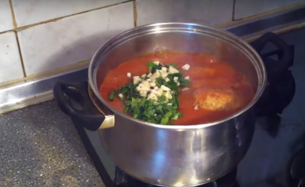 7. По прошествии времени залейте томатной массой голубцы и поставьте их на умеренный огонь. Накройте яство крышкой и готовьте его еще 1 час.