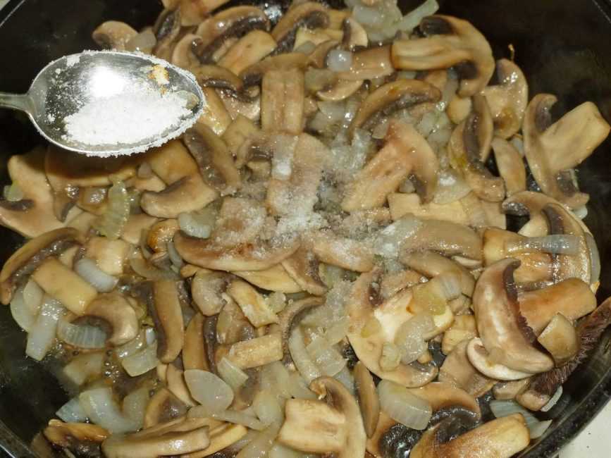 - Обжариваем немного лук и когда он примет «вялый» цвет, добавляем грибы. Перемешиваем и обжариваем 5–7 минут. Присаливаем грибы пол ч. л., и снимаем с огня.