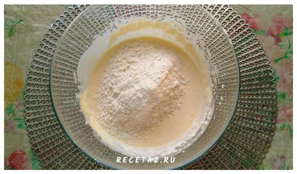 - Яйца взбейте с помощью венчика вместе с сахаром, добавьте чайную ложку разрыхлителя и стакан муки.