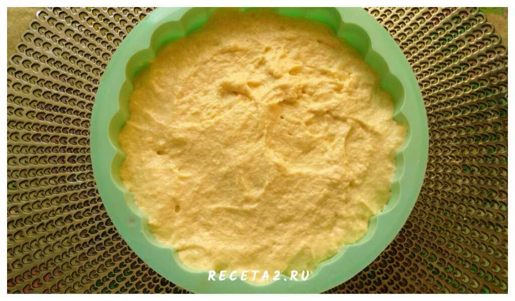 - В противень, смазанный маслом и присыпанный манной крупой (можно выпекать в сковороде со съемной ручкой), вылейте тесто и поставьте выпекаться корж в духовку на 40 минут. Температура – 190 ˚С.