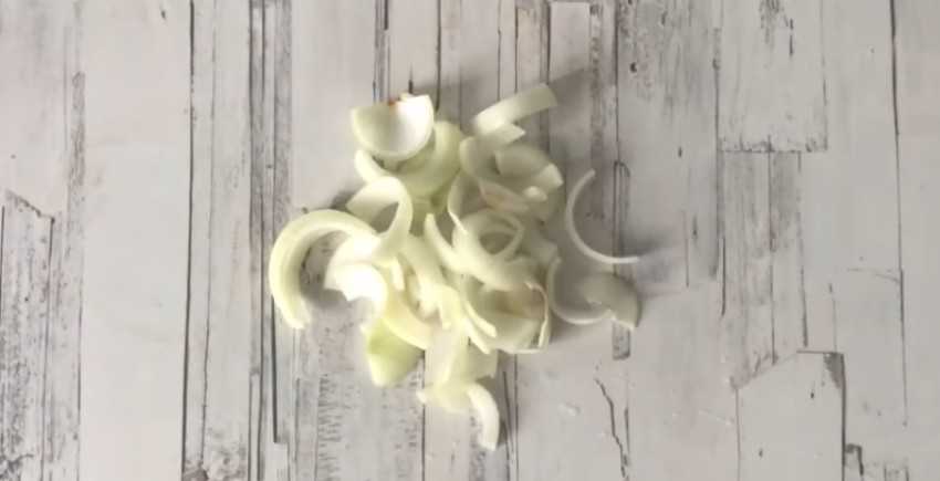 5.Пока тушатся грибы очистим лук и нарежем его на полу кольца.