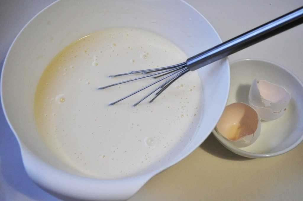 Далее к яично-сахарной смеси влить молоко. Затем добавить растительное масло и еще раз тщательно перемешать. Должна получиться смесь довольно приятной консистенции.