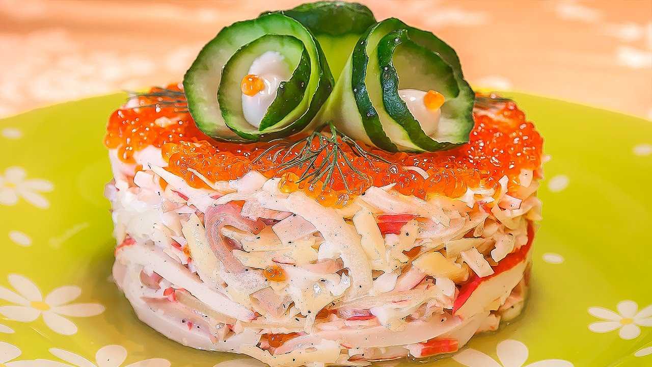 Ждете важных гостей и хотите удивить их кулинарным шедевром? Тогда данный рецепт салата именно для вас. Сочетание красной икры, морепродуктов и овощей подарит вам необычайно насыщенный вкус.