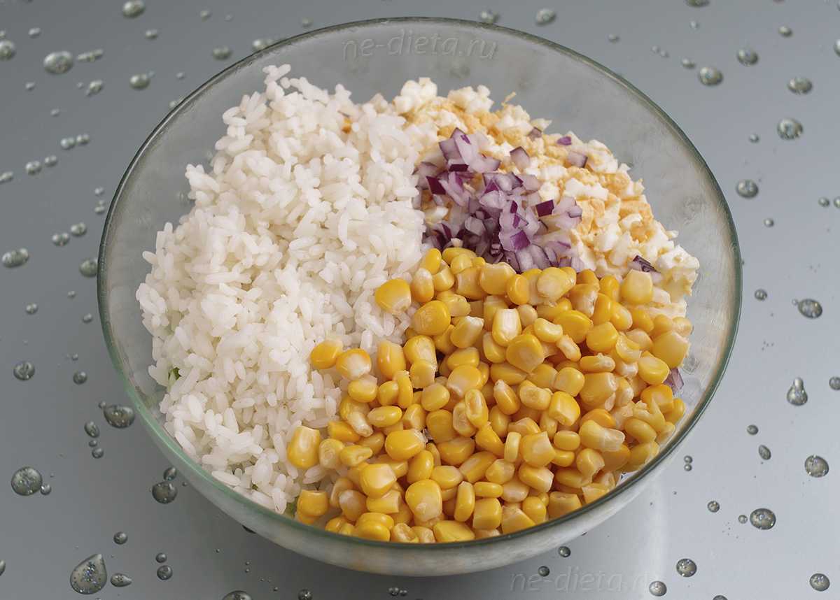 В крабовый салат добавить также охлажденный отварной рис и зернышки консервированной кукурузы.