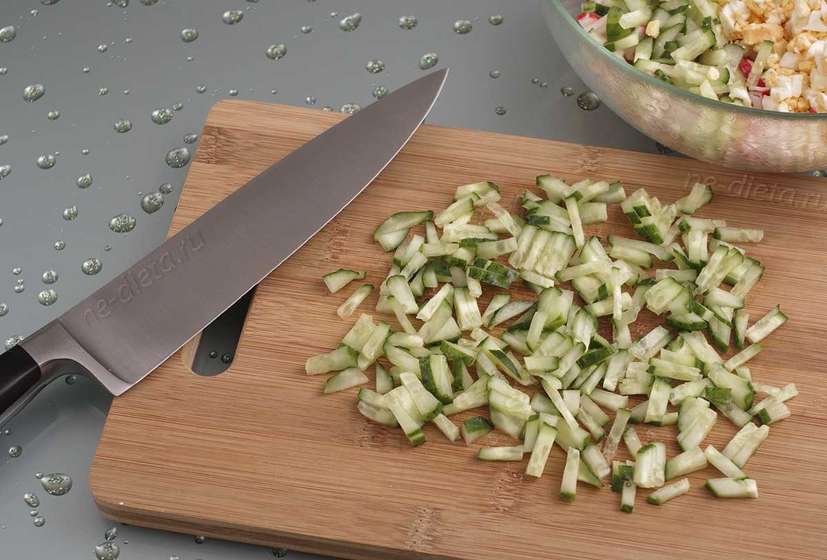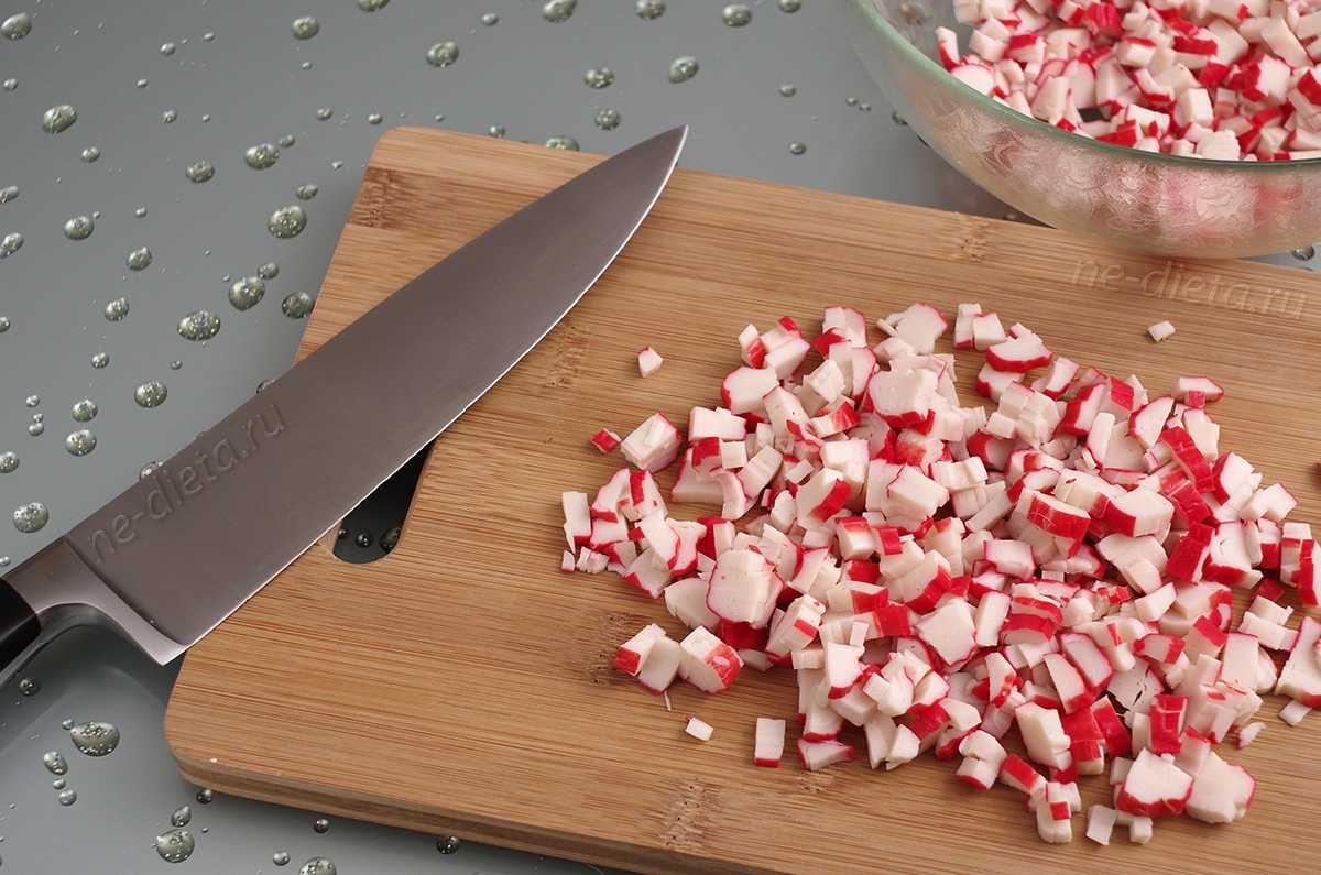 - Крабовые палочки нужно нарезать тонкой длинной соломкой по диагонали.