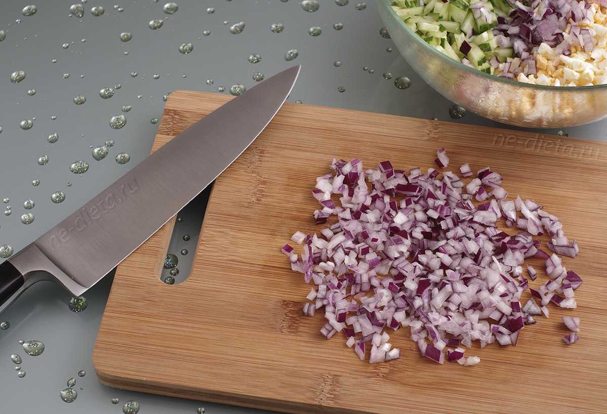 Репчатый лук нарезать как можно мельче и добавить в салатник. Лук придает этому салату пикантную остринку, однако, с ним очень нежелательно переборщить, поэтому лучше использовать сладкий салатный лук, а обычный можно ошпарить кипятком или добавлять в очень умеренных количествах.