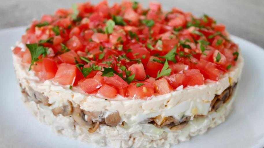 Слоеный салат с курицей, грибами и сыром на праздничный стол