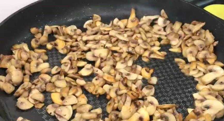 2. На разогретую сковороду налейте небольшое количество растительного масла. Обжарьте в нем мелко нарезанный лук до мягкости. Затем добавьте кусочки шампиньонов и перемешайте. Жарьте 10 минут на среднем огне, периодически помешивая. За 2 мин. до готовности добавьте соль, черный молотый перец по вкусу.