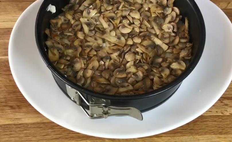 Слоеный салат «Грибная поляна» с копченой курицей и картошкой