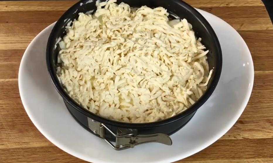Первый слой – картошка. Она достаточно плотная, поэтому будет прекрасно держать на себе все последующие «этажи». И, когда вы возьмете свою порцию, она будет подниматься вместе с первым слоем.
