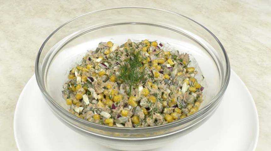 - Смешать в глубоком салатнике кукурузу, кусочки рыбы и луковую соломку.