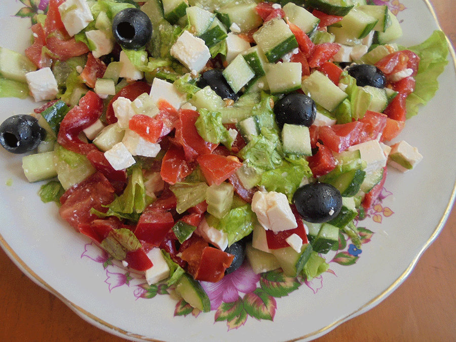 Разноцветный Греческий салат очень красив, здесь и зеленый, и черный, и красный, и даже белый цвет. Обязательно приготовьте его и поставьте в центр стола. Не забудьте подать к салату кулинарные щипцы, чтобы его было удобно раскладывать.