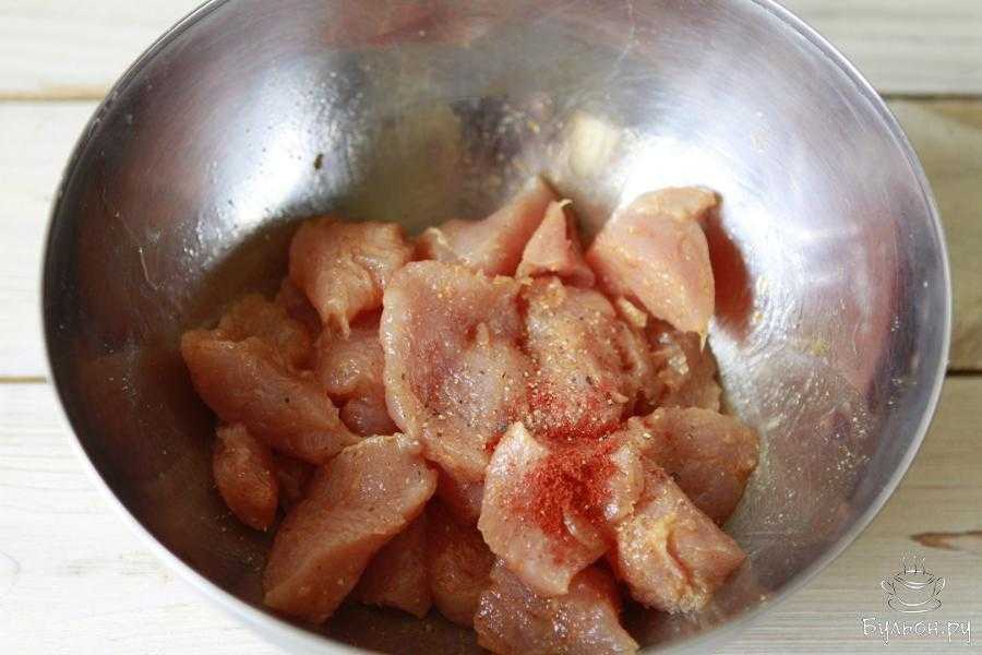 1. Мясо нарежьте не крупными кусками, положите в блюдо. Посолите и добавьте специи. Размешайте все.