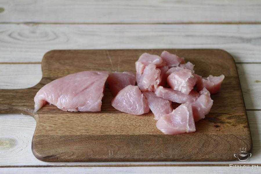 Филе индейки промыть, обсушить бумажным полотенцем и нарезать на небольшие кусочки одинакового размера.