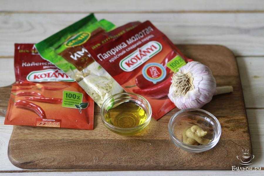 Для маринада приготовить все специи по списку, зубчик чеснока, горчицу и оливковое масло. Если вы готовите блюдо для детей, перец чили можно исключить.