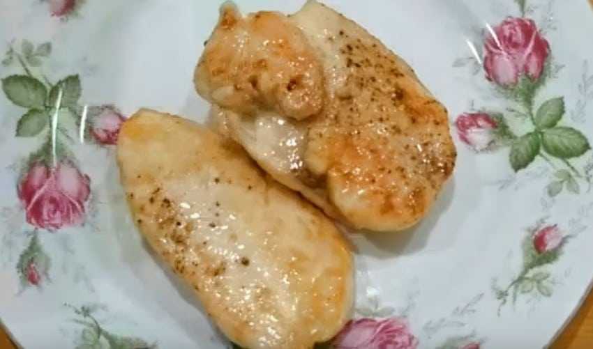 3.Курицу посолить, приперчить и натереть. По желанию, можно добавить любимых специй, на ваш вкус. Оставить в таком виде на полчаса. Затем обжарить на сковороде с постным маслом, с двух сторон, до легкой румяности. Затем залить сюда миллилитров 50 воды и потушить под крышкой минут 20.