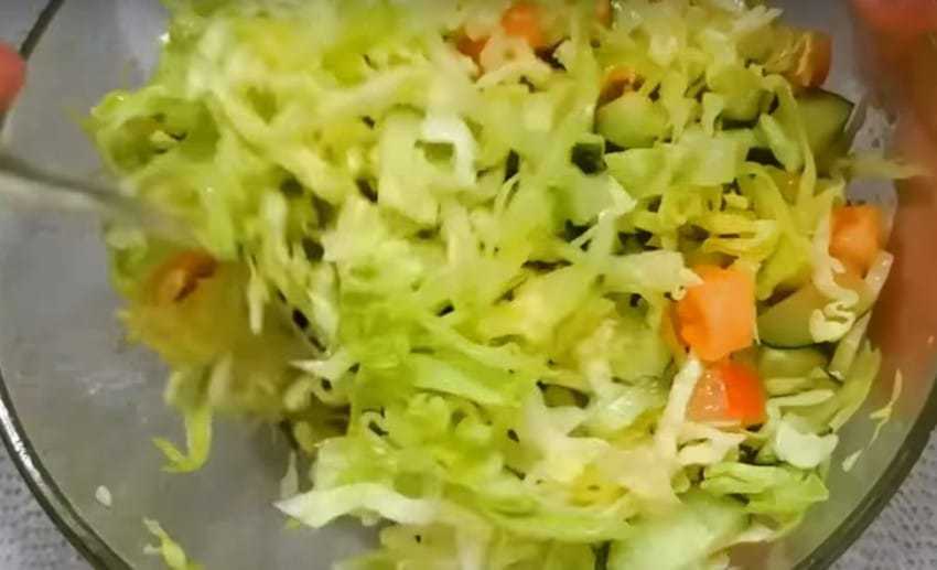 1.Тонко нашинковать капусту. Отправить ее в салатник.
