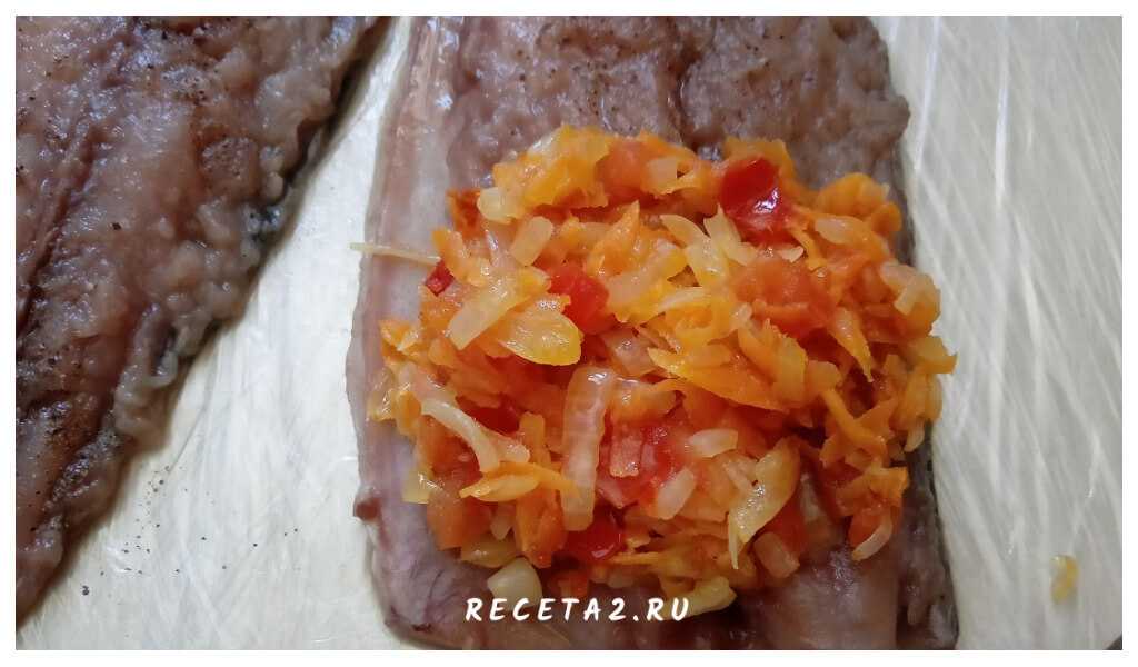 Каждую рыбную половинку приправляем солью и перцем, а также смачиваем соком лимона. Оставляем. Нарезку лука и томата делаем небольшими квадратиками. Морковь нашинкуйте на крупных отверстиях терки. После этого на сковороде с подсолнечным маслом пассируем луково – морковную смесь. Добавляем помидор, солим, перчим и тушим еще 5 – 7 минут. Пусть овощи остынут. Мелко натертый сыр я беру грамм 20. Он, как скрепляющий элемент в этой заготовке. Можно готовить и без него. В любом случае будет очень вкусно.