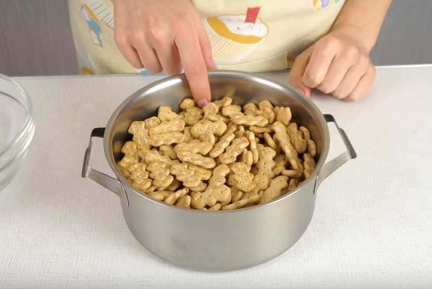 1. Возьмите кастрюлю для торта: всыпьте печенье. До верха у вас должно остаться не менее 3 см. Это пространство заполнится желе и сметаной.
