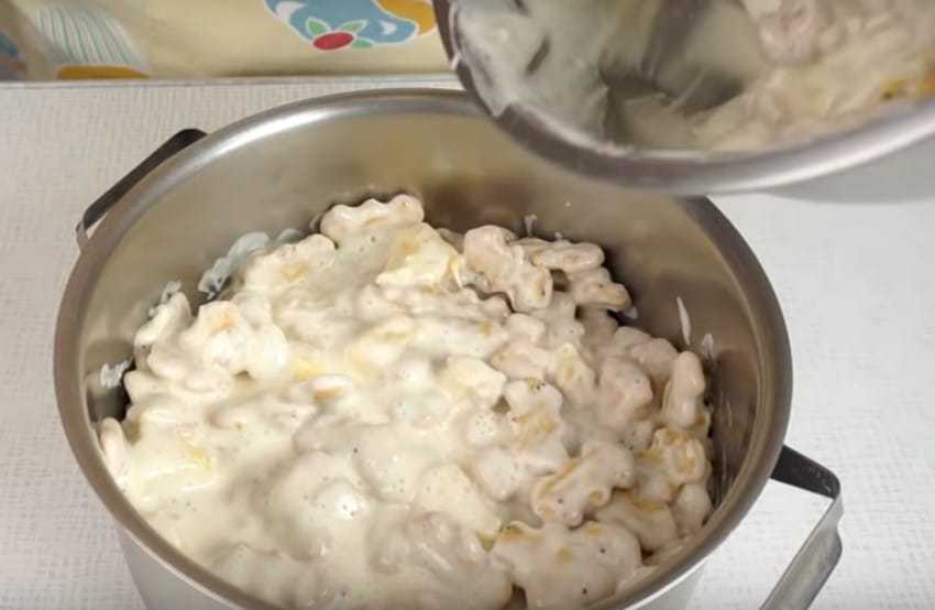 5.Перелейте назад в кастрюлю с оставшимся молоком всю заварившуюся массу, соедините венчиком.