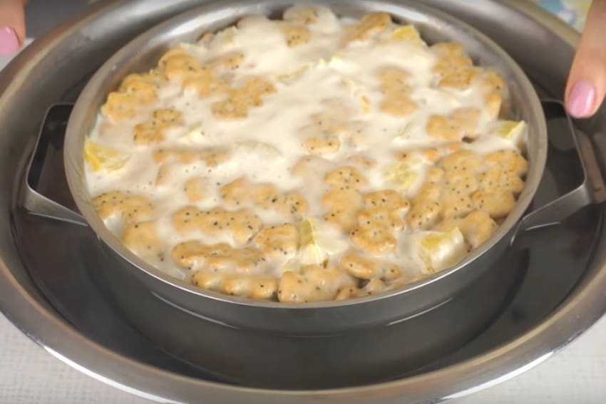 В исходном рецепте используется крекер с маком. Вы можете приготовить из любого сухого печенья на ваш вкус, только поломайте его на маленькие кусочки. А чтобы снизить калорийность, вместо сметаны используйте просто йогурт и сливки, загущенные желатином